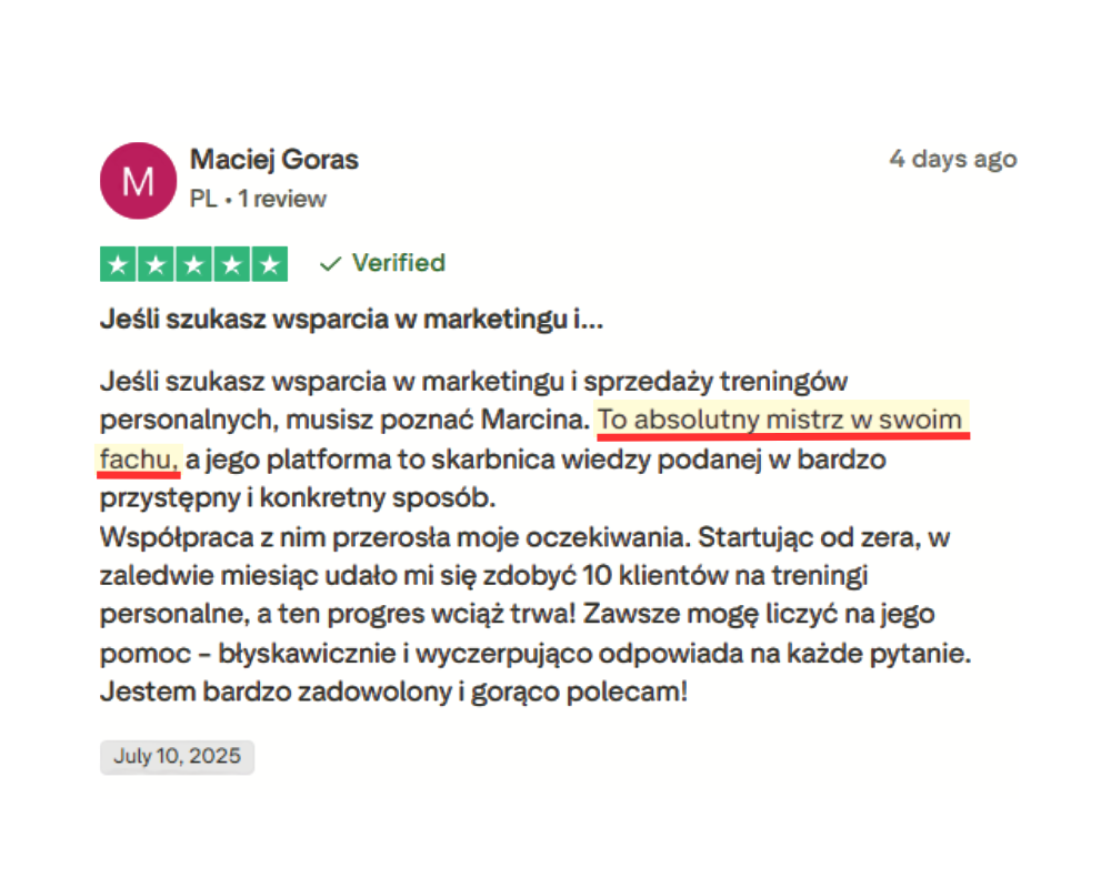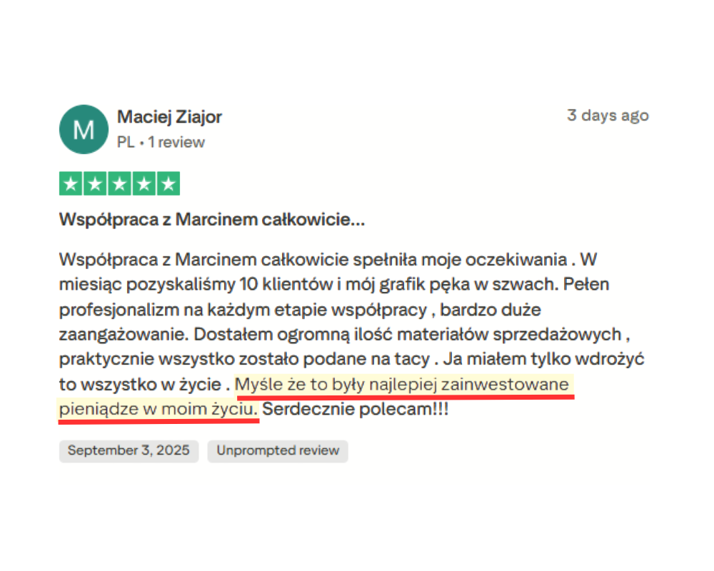 Wszystkie opinie na tej stronie pochodzą od prawdziwych klientów. Wyniki przedstawione na tej stronie nie są typowe. Ich doświadczenia nie gwarantują podobnych rezultatów. Indywidualne wyniki mogą się różnić w zależności od Twoich umiejętności, doświadczenia, motywacji oraz innych nieprzewidzianych czynników. Firma nie przeprowadziła jeszcze badań dotyczących wyników swoich typowych klientów. Twoje wyniki mogą się różnić.